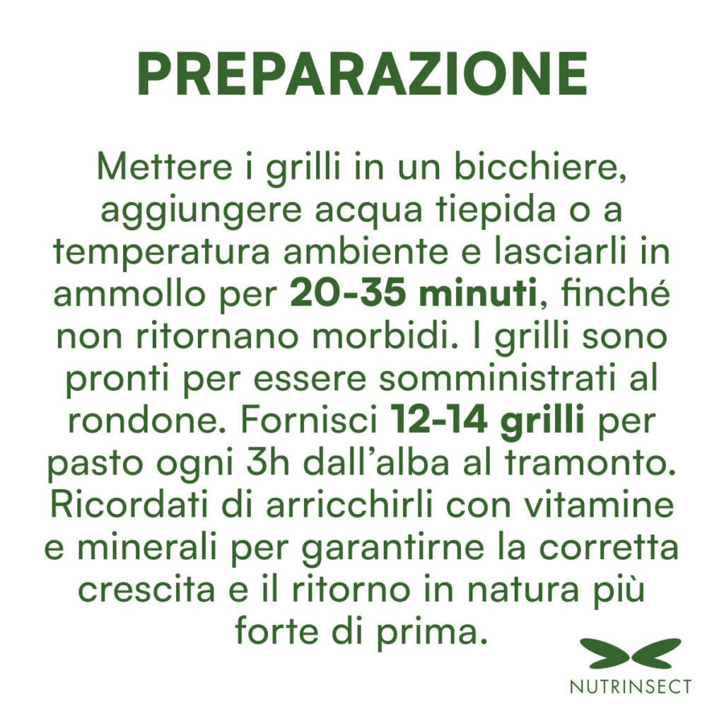 1. Prelevare la quantità necessaria di grilli per l’imbecco.Immergerli in un bicchiere con acqua a temperatura ambiente o tiepida.Lasciarli in ammollo per 20-35 minuti, fino a che non tornano morbidi e completamente reidratati.Una volta pronti, possono essere somministrati direttamente agli uccelli. Ricordati di integrare la dieta con un multivitaminico e sali minerali per un’alimentazione completa.